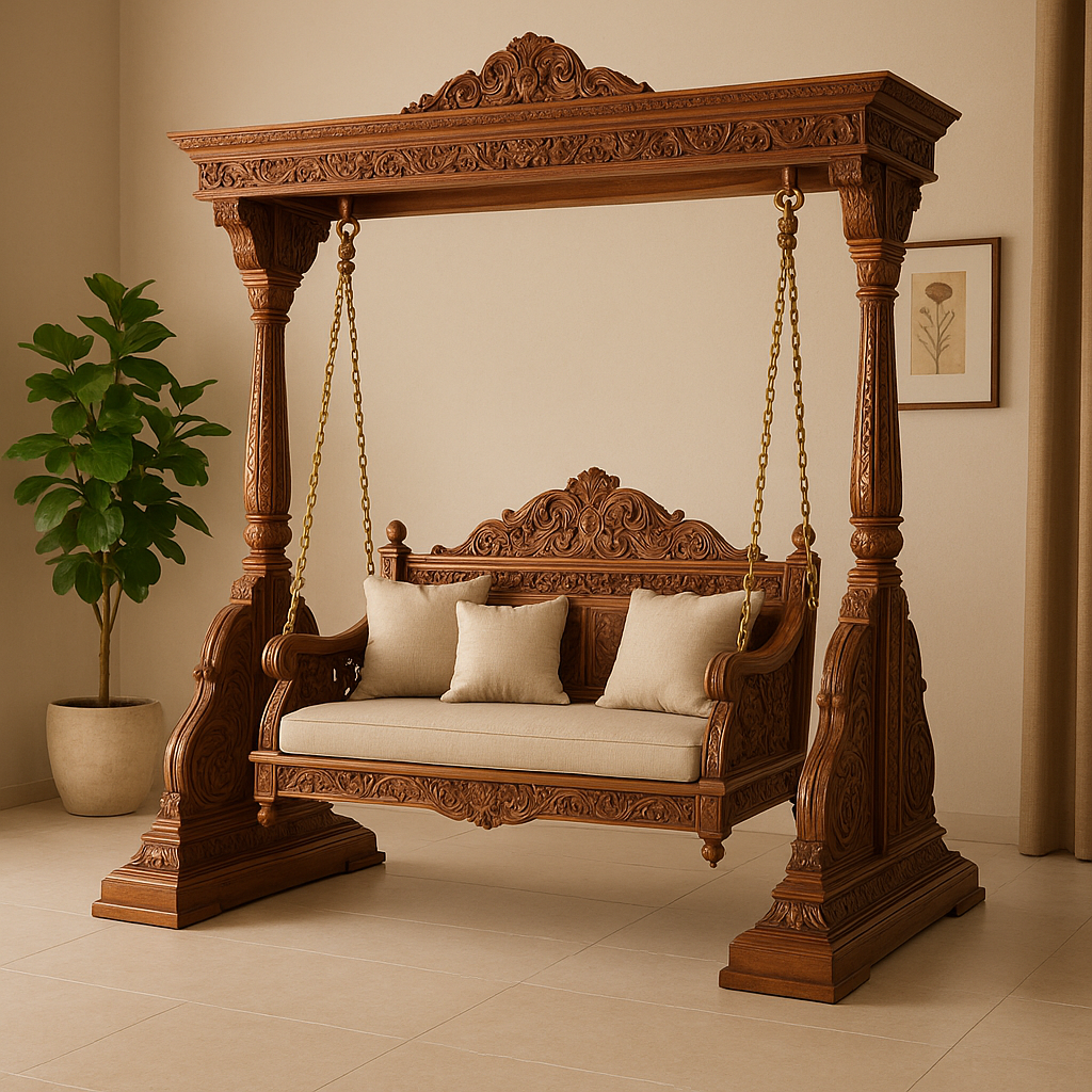 A wooden home jhula is so adjustable that it can be used for any event. Whether it’s a traditional home decor for Diwali, Indian wedding decorations, or just a lazy day, a luxury temple or wooden swing adds elegance to any room. It’s not furniture; it’s part of creating memories that last.